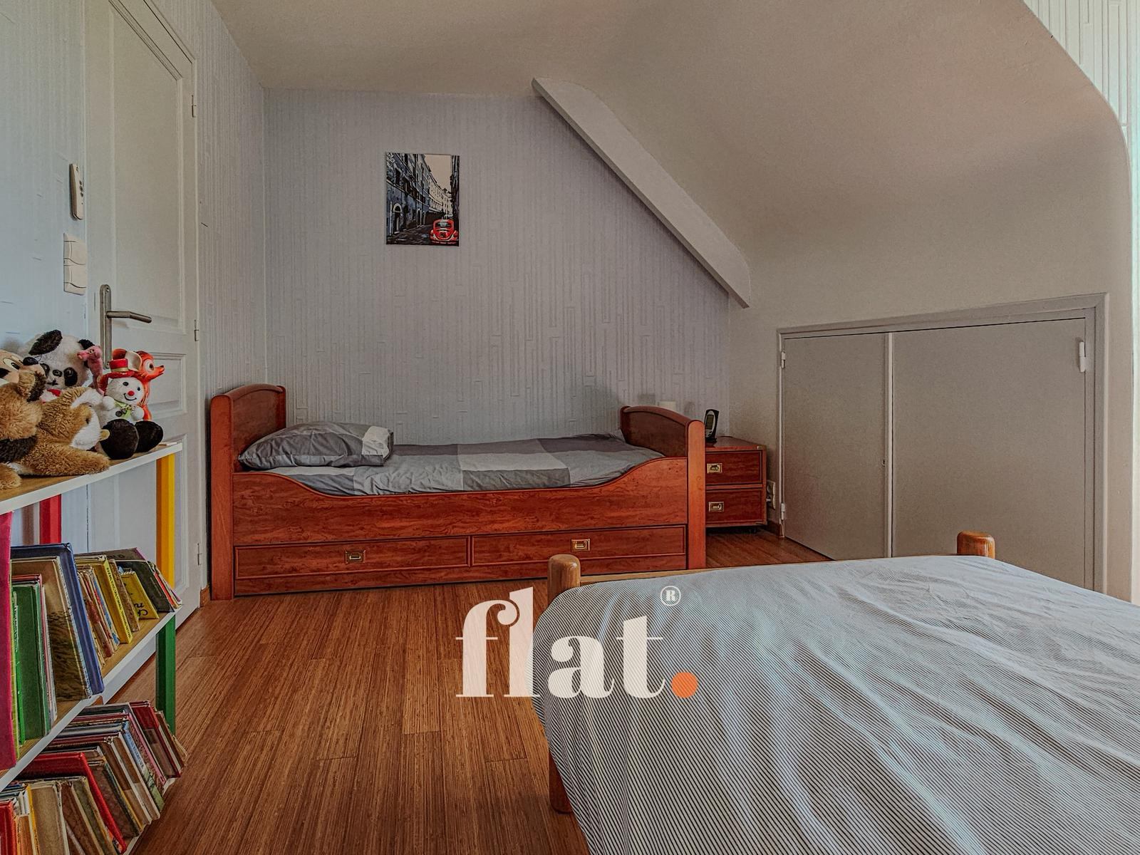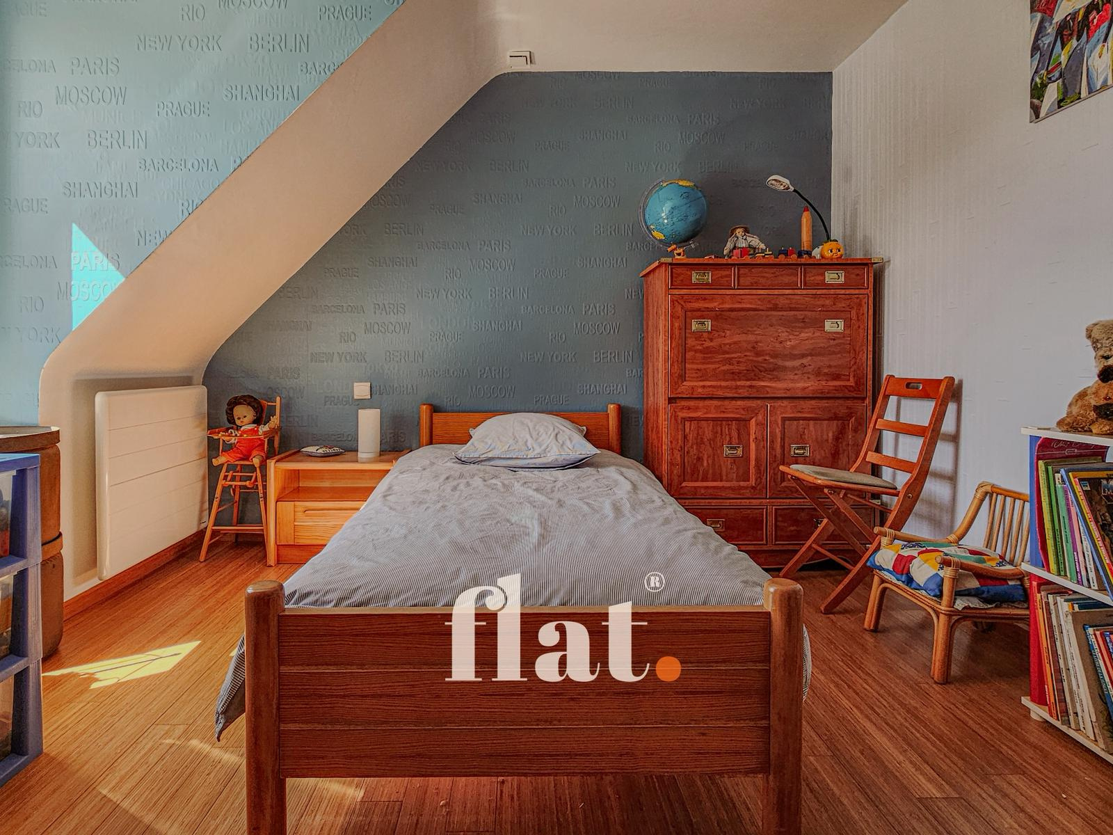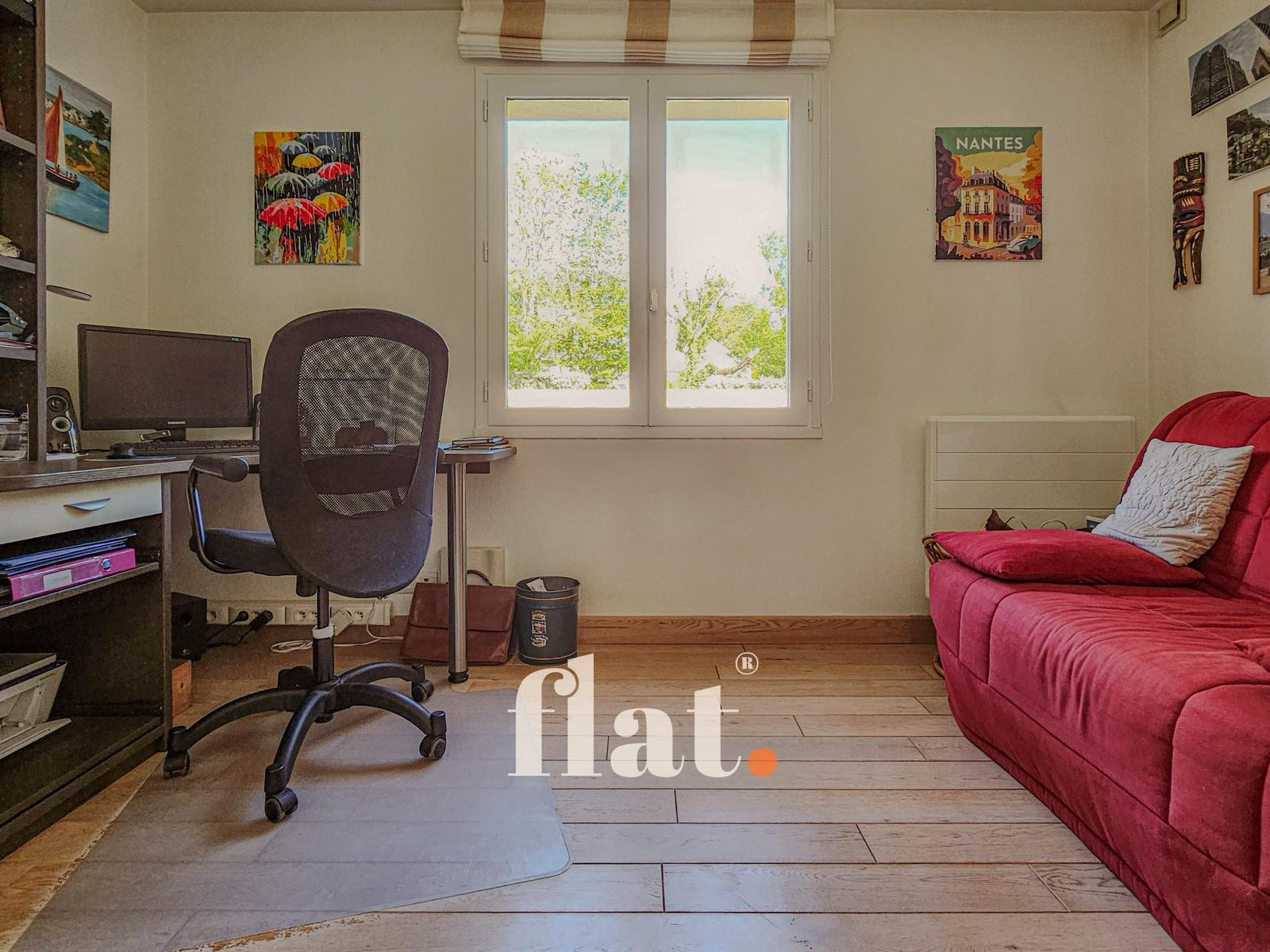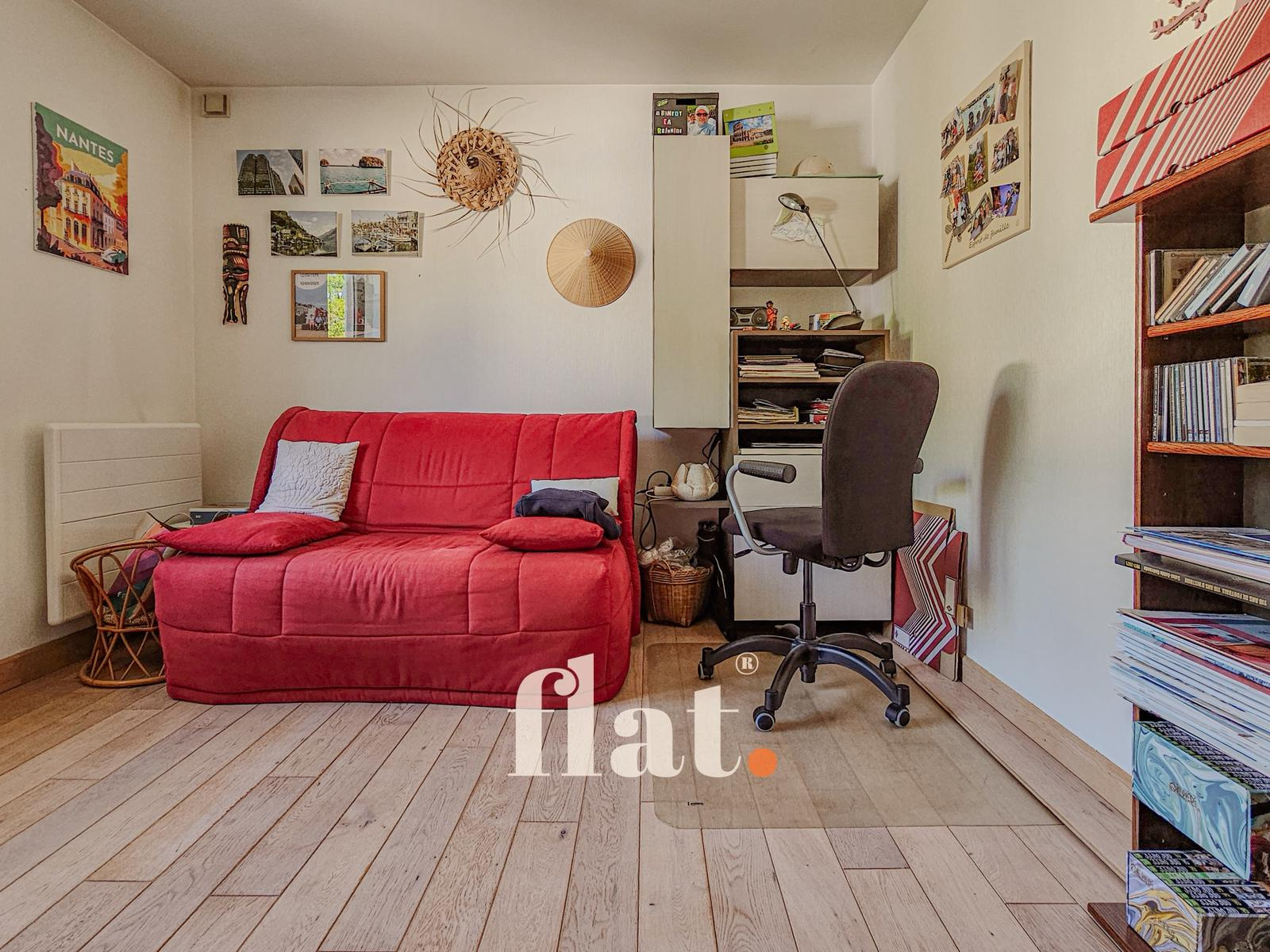 Une chambre de plain-pied d’environ 12 m² (actuellement utilisée comme bureau) offre la possibilité de créer une salle d’eau pour une vie de plain-pied.