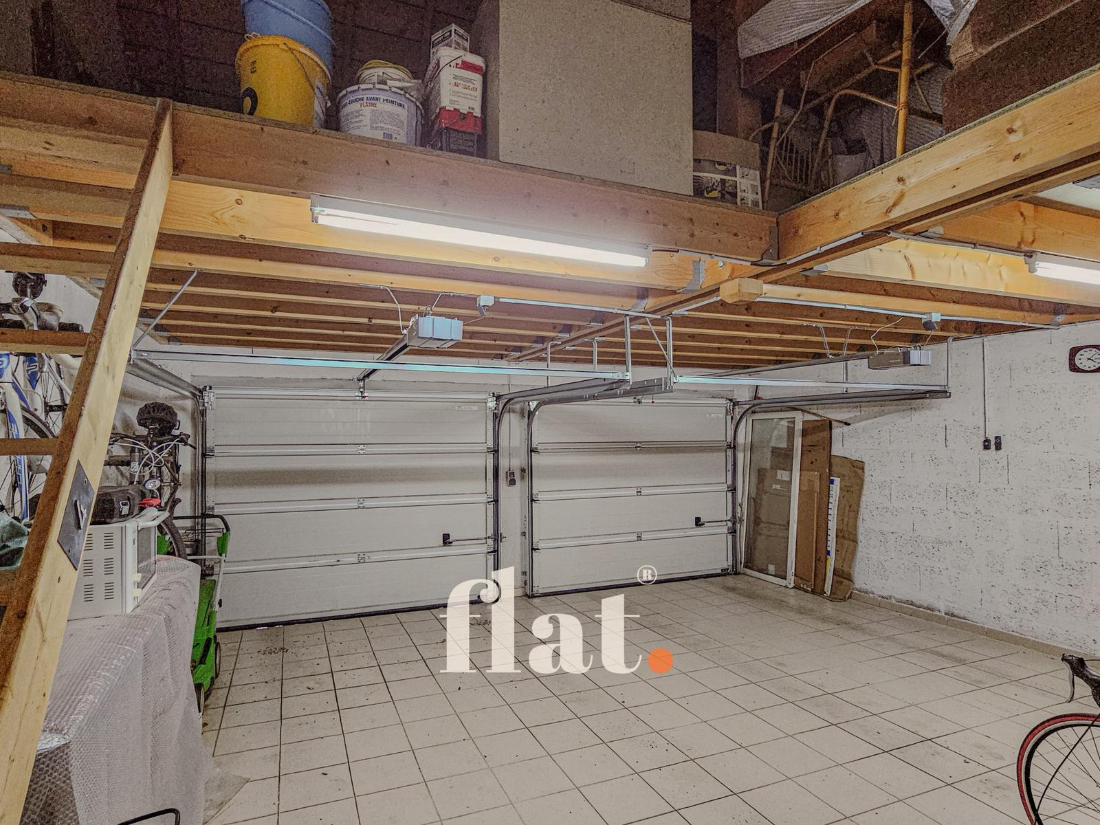 Garage double avec porte motorisée + un à deux stationnements sur la parcelle, grenier en mezzanine de 21 m², un bûcher d’environ 7 m².