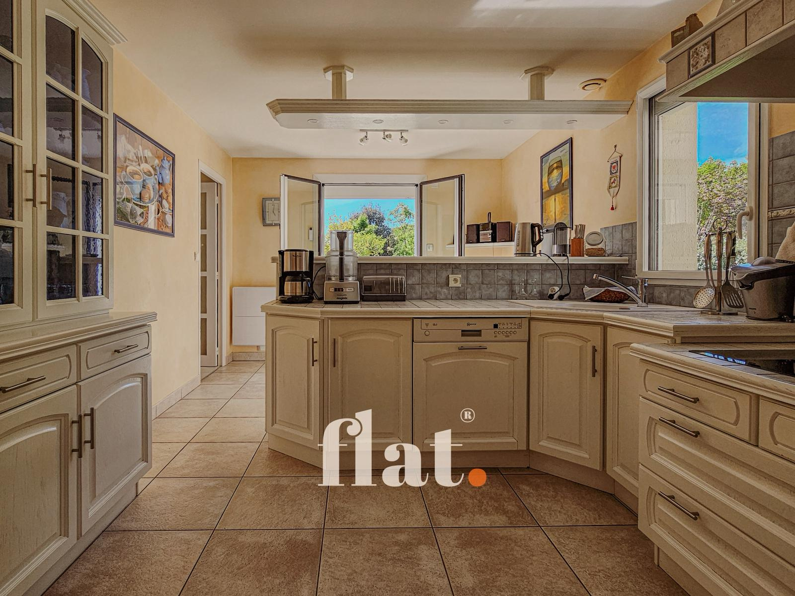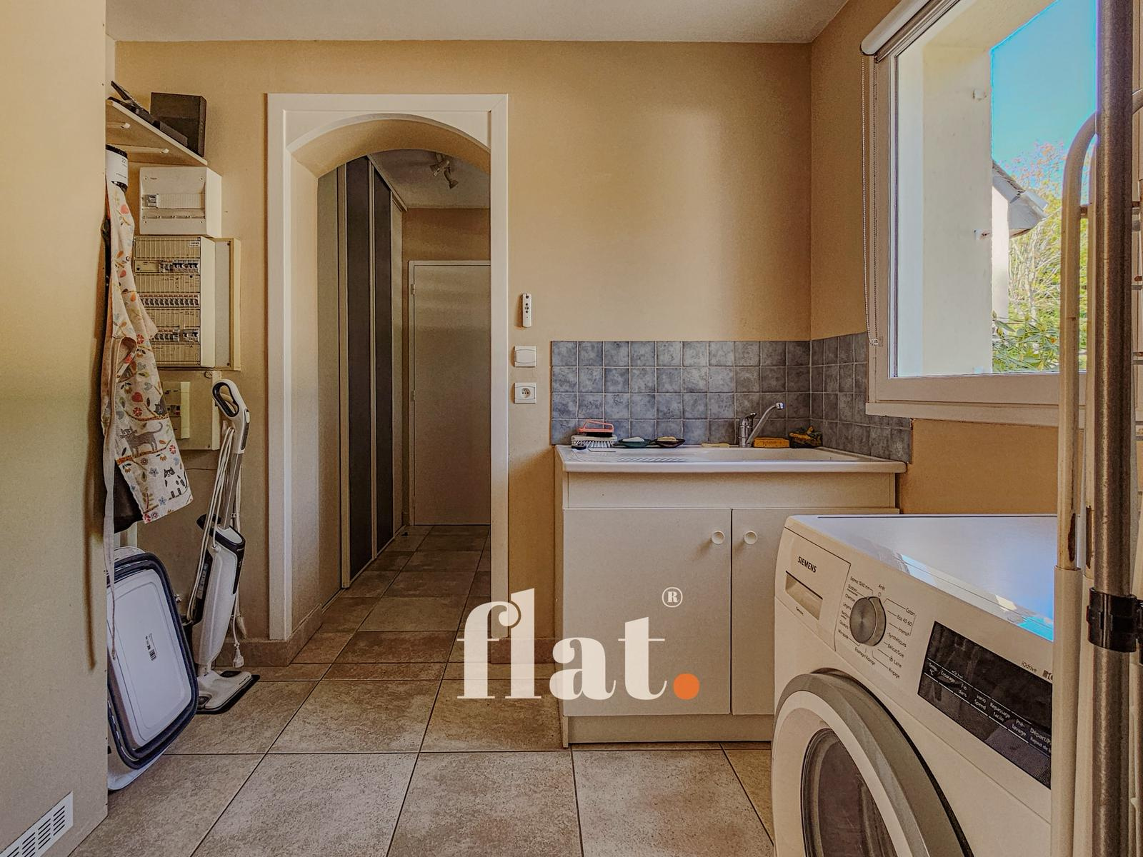 La cuisine indépendante d’environ 16 m² (possibilité d’ouverture sur le salon) est complétée par une arrière-cuisine / buanderie de 7 m² ainsi qu’un cellier de 6,5 m².