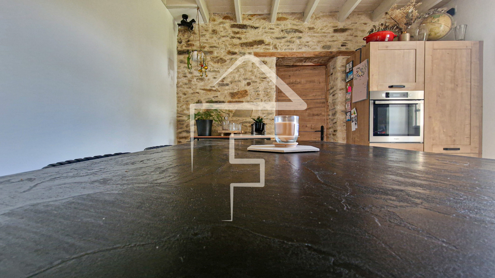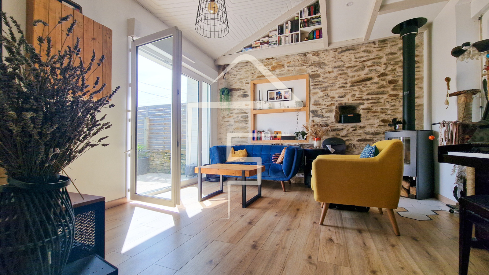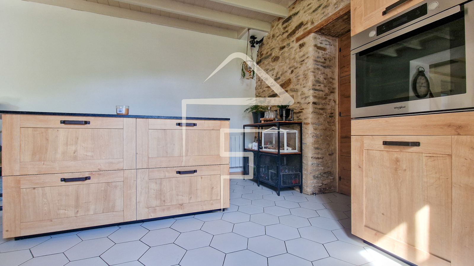 Par l'entrée, vers la gauche, nous accédons à la cuisine séparée aménagée et équipée, Dans le prolongement, se dessine la pièce de vie claire, lumineuse, avec un poêle à bois, une belle hauteur sous plafond, une mezzanine et une ouverture directe sur le jardin avec la terrasse.