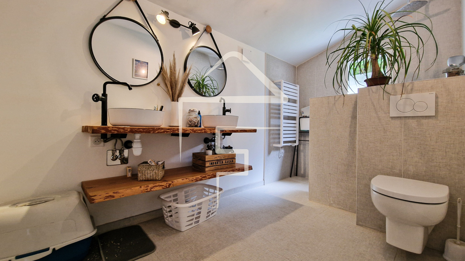 La salle d'eau spacieuse, avec sa douche à l'italienne, ces Wc suspendus et sa grande vasque permettent une cohabitation possible entre les membres de la famille.