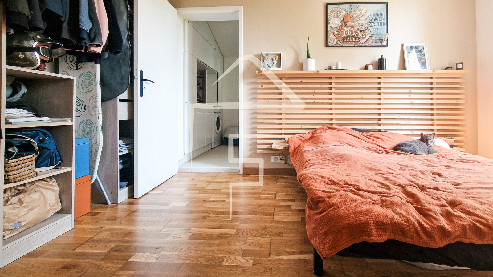 En revenant, vers l'entrée, sur la droite, nous arrivons dans la grande chambre, marquée par son exposition favorable qui baigne l'espace d'une douce lumière naturelle tout au long de la journée. Un dressing conséquent donne un élément de confort supplémentaire à cet environnement cocooning ou tout est optimisé.