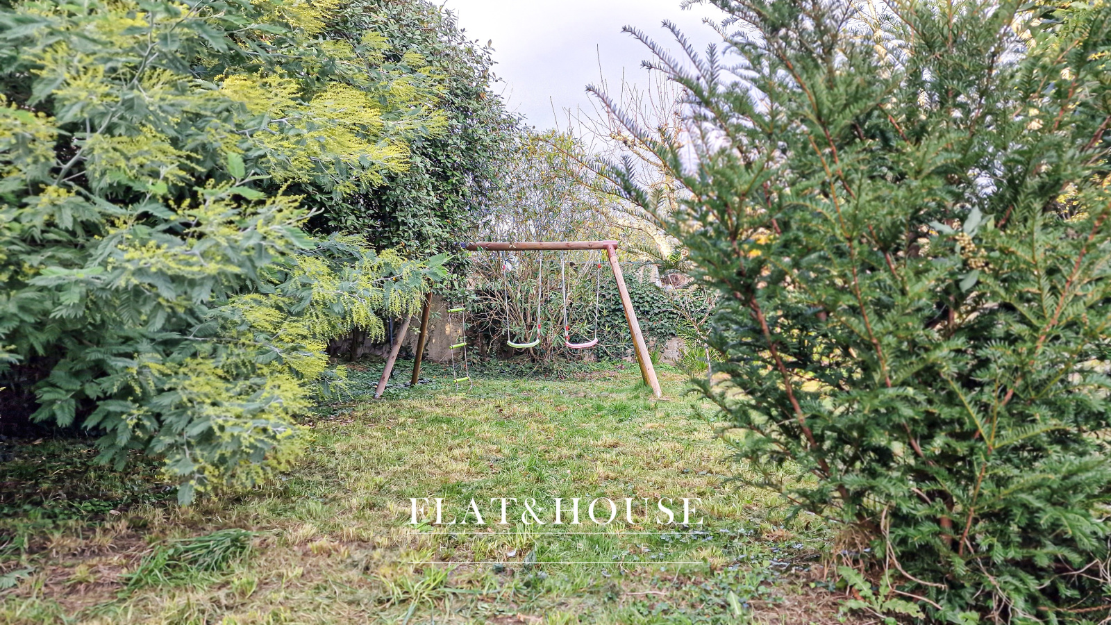 Jardin agrémenté de nombreux grands arbres, arbustes et plantes : mimosas, cerisiers, poiriers, lauriers, érables, ....