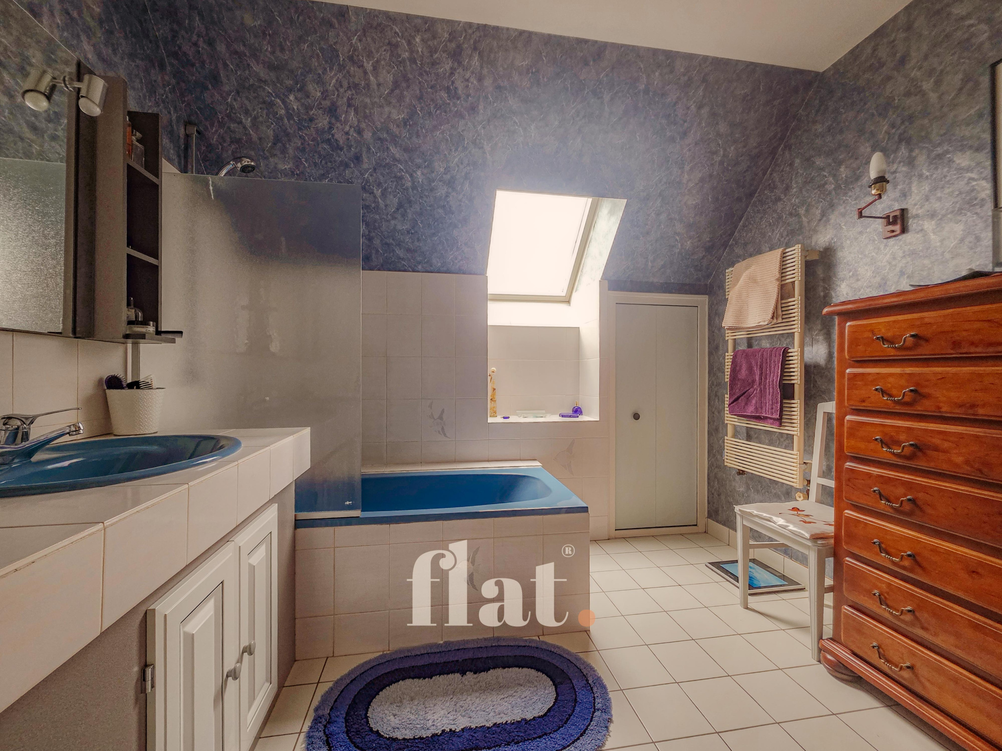 La salle de bains familiale, spacieuse, dispose d'une baignoire et d'une double vasque.