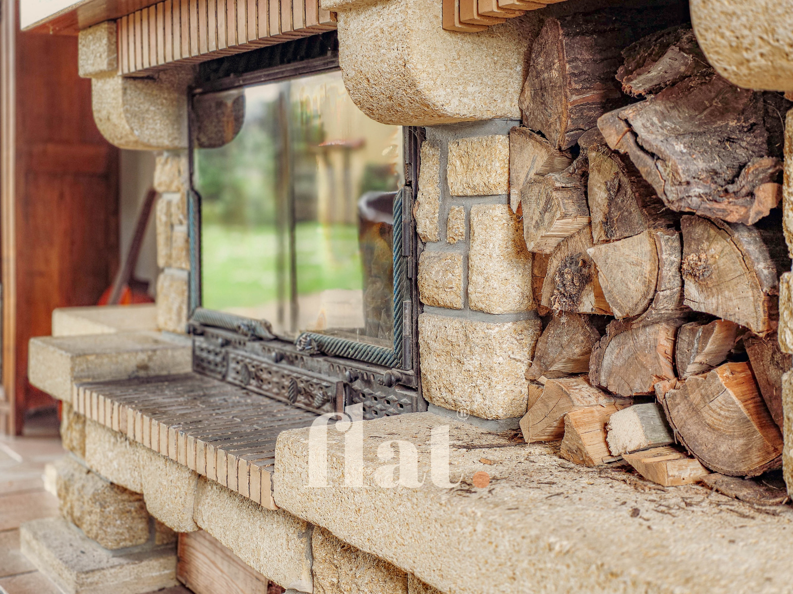 - Pièce de vie : Traversante et spacieuse, avec cheminée authentique et poêle à granules, donnant sur le jardin